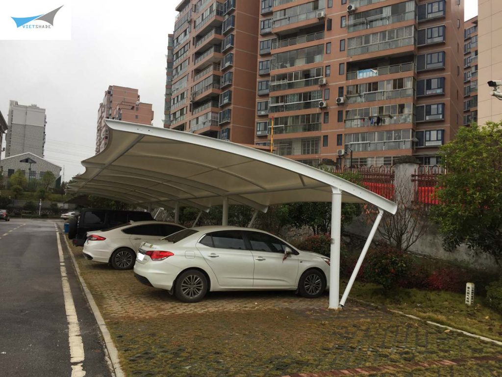 Thiết kế nhà để xe bằng cấu trúc bạt kéo căng  là thiết kế đương đại trong kết cấu mái che . Nó thường được sử dụng ở những nơi hạn chế về chiều cao Chẳng hạn như khu dân cư, biệt thự tư nhân, nhà máy, cơ quan… Nhà để xe ô tô có thể tạo ra một diện mạo và màu sắc phù hợp với cảnh quan  xung quanh. Ngoài ra, thời gian xây dựng sẽ rất ngắn. Cấu trúc đơn giản và đẹp mắt vì màng PVDF chất lượng cao và rất thẩm mỹ